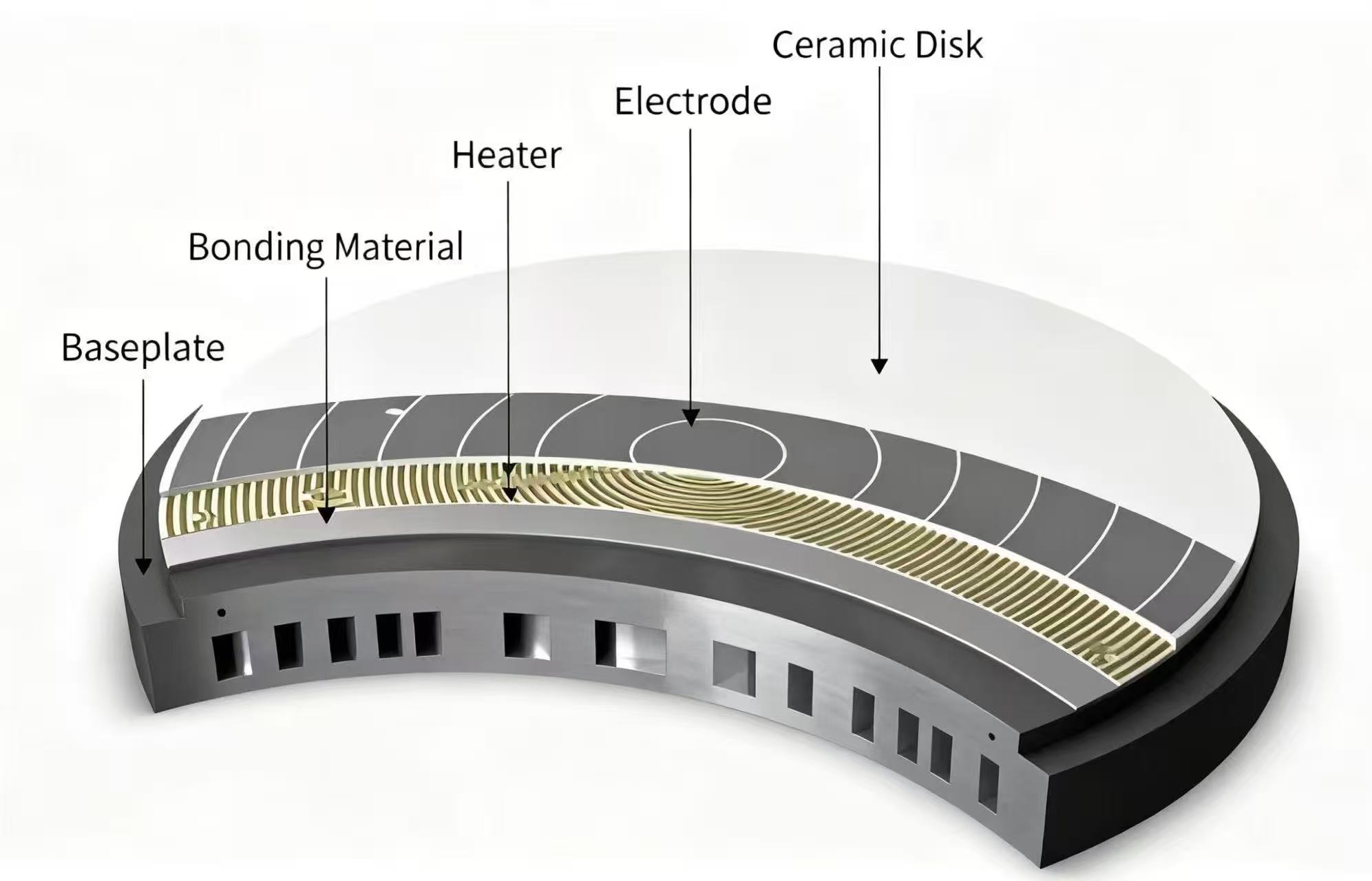 تحتوي بعض ظرف السيراميك الكهروستاتيكية على وظائف تسخين متكاملة، والتي يمكنها التحكم بدقة في درجة حرارة الرقاقة من خلال غاز النفخ الخلفي أو أقطاب التسخين الداخلية، والتكيف مع متطلبات درجة الحرارة الصارمة للعمليات المختلفة، وتحسين استقرار المعالجة.