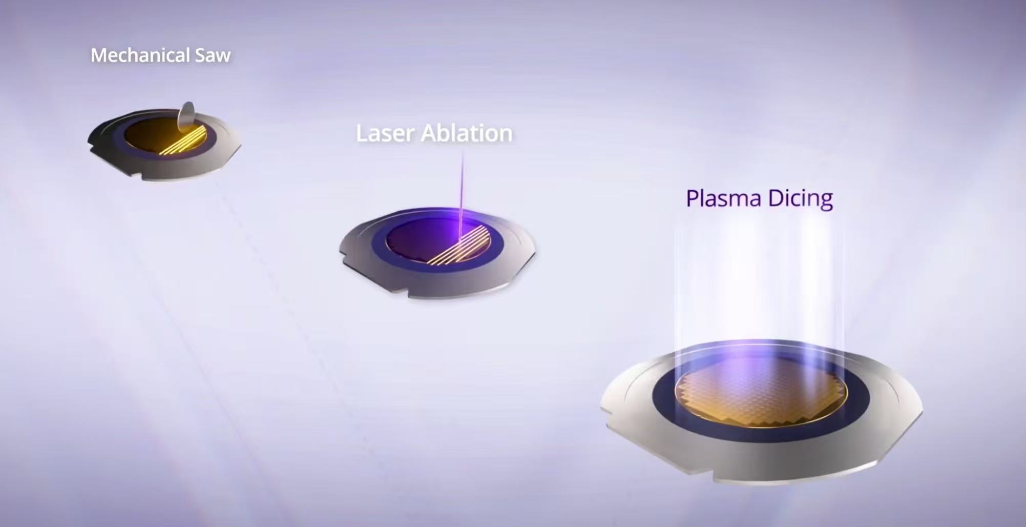 إن تقطيع الرقاقات هو الخطوة الأخيرة في عملية تصنيع أشباه الموصلات، حيث يتم فصل رقائق السيليكون إلى شرائح فردية (وتسمى أيضًا القوالب). تستخدم الطرق التقليدية شفرات الماس أو الليزر لقطع شوارع التقطيع بين الرقائق، وفصلها عن الرقاقة. يستخدم تقطيع البلازما عملية الحفر الجاف لحفر المواد الموجودة في شوارع التقطيع من خلال بلازما الفلور لتحقيق تأثير الفصل. مع تقدم تكنولوجيا أشباه الموصلات، يطلب السوق بشكل متزايد شرائح أصغر وأرق وأكثر تعقيدًا. يحل تقطيع البلازما محل شفرات الماس التقليدية وحلول الليزر تدريجيًا لأنه يمكن أن يحسن الإنتاجية والقدرة الإنتاجية ومرونة التصميم، ليصبح الخيار الأول لصناعة أشباه الموصلات.