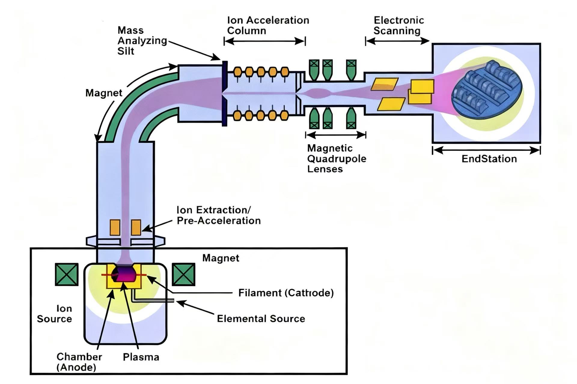 2. إن زرع الأيونات هو تقنية المنشطات الأساسية في تصنيع أشباه الموصلات، والتي تتمتع بالعديد من المزايا، مثل دقة المنشطات العالية، ودرجات حرارة العملية المنخفضة، والضرر القليل الذي يلحق بمواد الركيزة. على وجه التحديد، تستلزم عملية زرع الأيونات تأين ذرات الشوائب لتكوين أيونات مشحونة، ثم تسريع هذه الأيونات عبر مجال كهربائي عالي الكثافة لتشكيل شعاع أيوني عالي الطاقة. يتم بعد ذلك ضرب سطح أشباه الموصلات بهذه الأيونات سريعة الحركة، مما يسمح بزرع دقيق بعمق منشط قابل للتعديل. تعتبر هذه التقنية مفيدة بشكل خاص لإنشاء هياكل الوصلات الضحلة، مثل مناطق المصدر والصرف للدوائر المتكاملة منخفضة المقاومة (MOSFET)، وتسمح بالتحكم عالي الدقة في توزيع وتركيز الشوائب.